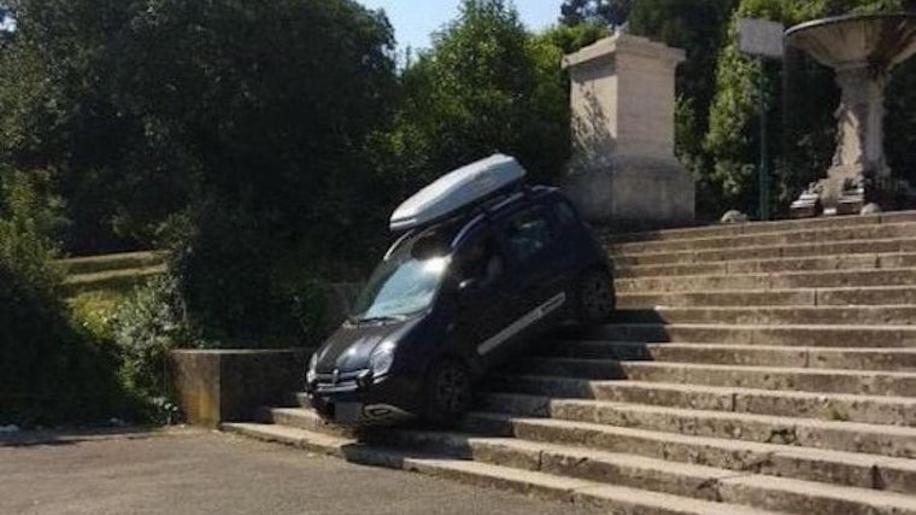 Una scena incredibile che è stata ripresa da qualche passante. Nel video si vede l’automobile dell’uomo scendere senza nessuna difficoltà la scalinata, passando molto vicino anche alle due fontane gemelle, simbolo dell’opera.