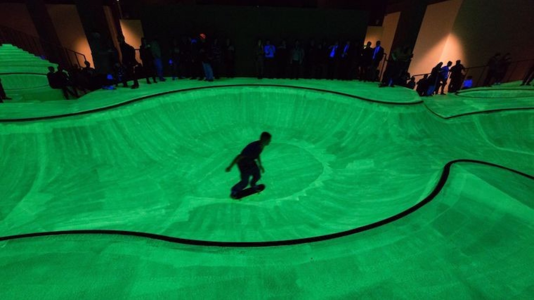 Tante sono le particolarità che rendono OooOoO – è il nome dell’installazione – perfettamente coerente coi criteri dettati dai curatori della manifestazione, a partire ovviamente dalla natura site specific dell’opera, passando per la gratuità dell’evento per arrivare alla praticabilità e alle stesse fattezze della costruzione, interamente ricoperta da una vernice verde fluo che, attivata da luci UV, fa scintillare al buio il suo percorso tipicamente irregolare fatto di rampe, bowsl e halfpipes. Tutto questo rende l’esperienza perfettamente multisensoriale, grazie anche all’apporto sonoro messo a disposizione da Koreless, produttore di musica elettronica di Glasgow.