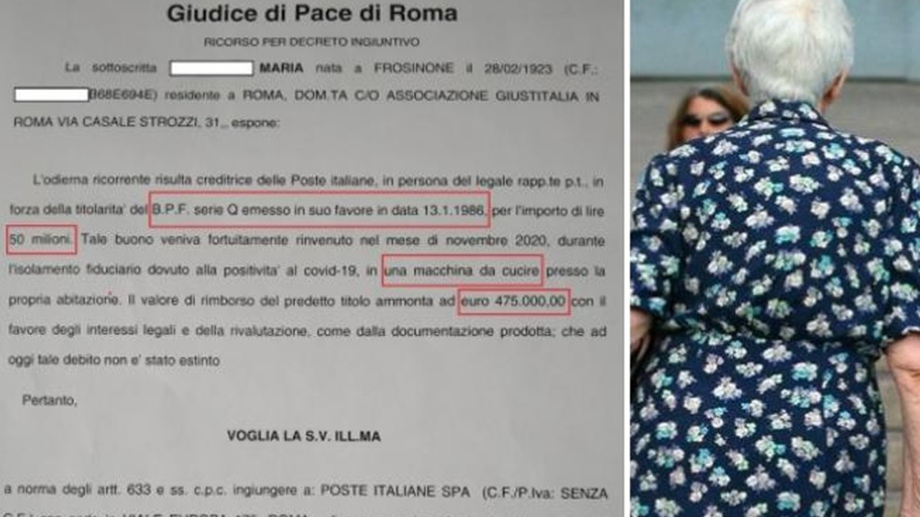 La vicenda è diventata di dominio pubblico perché, quando i familiari della donna si sono presentati in Posta per riscuotere il malloppo, hanno scoperto che i conti non tornavano: «Le Poste per quel buono fruttifero da 50 milioni di lire hanno previsto la restituzione di oltre 200mila euro, ma si tratta di un calcolo sbagliato per difetto, in quanto sono stati applicati i tassi d’interesse che si sono succeduti negli anni e non quelli scritti sul retro. Per questo siamo intervenuti noi, dopo aver calcolato la cifra esatta, pari a quasi il doppio, 475mila euro, con un ricorso per decreto ingiuntivo al giudice di pace», ha spiegato Luigi De Rossi presidente di Giustitalia, associazione che si occupa dei consumatori e della tutela dei cittadini.