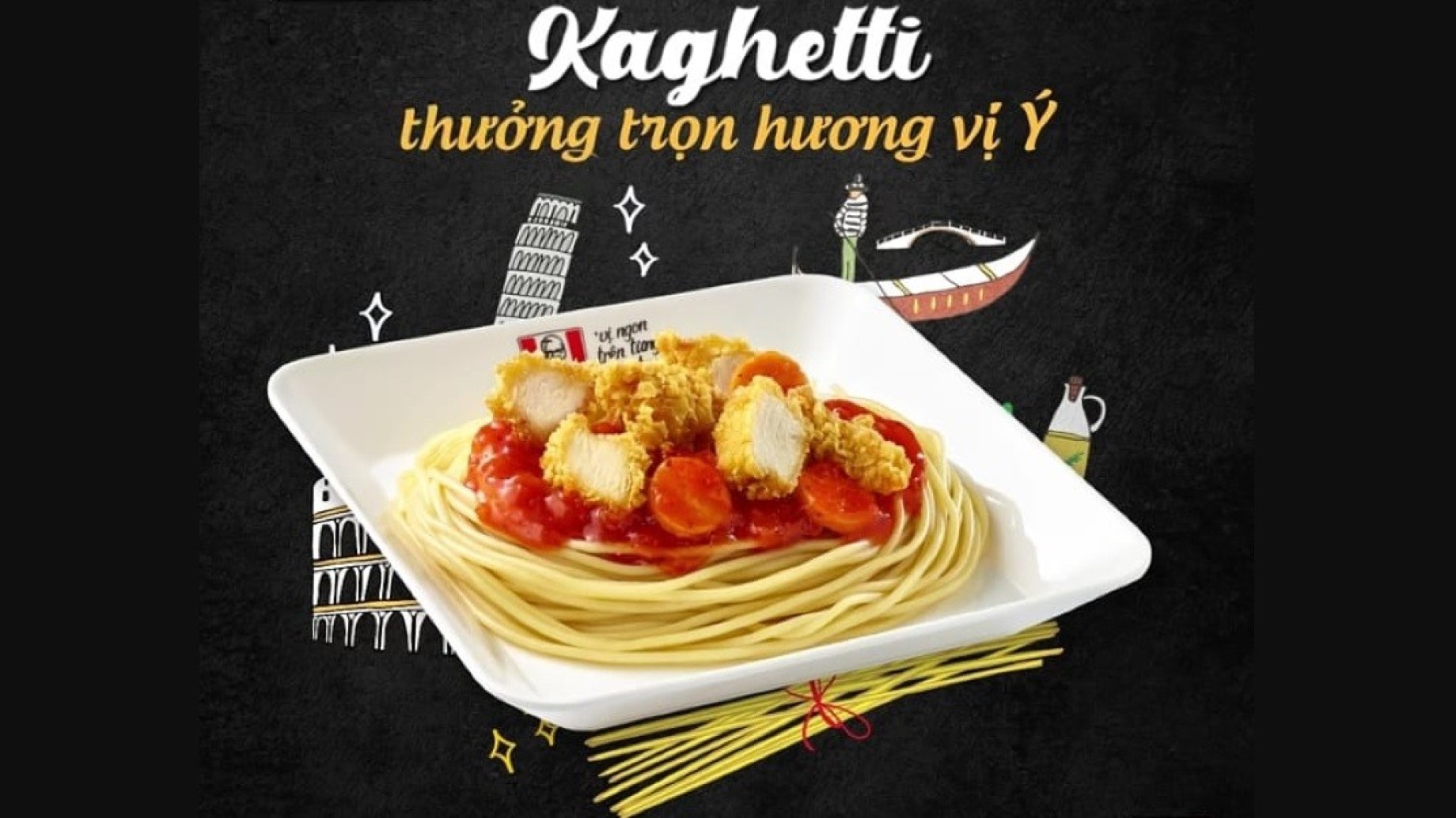 Combinazione perfetta, eh? L’immagine, che dovrebbe essere accattivante, mostra spaghetti scotti disposti ordinatamente, sopra i quali dovrebbe esserci una salsa di pomodoro (ma chi può dirlo). E poi, dulcis in fundo, il pollo fritto come ciliegina sulla torta. Non ci resta che aspettare la fine della pandemia, un bel viaggetto in Vietnam giusto giusto per passare da un KFC ad assaggiare i Kaghetti. Che se siete stitici sembra davvero un’ottima idea.