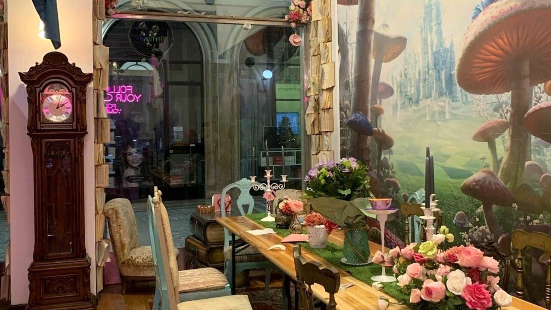 Se poco poco conoscente il mondo di Alice, rimarrete stupiti e affascinati dal Rabbit Hole. Le scenografie, interamente fatte a mano, ritraggono i personaggi principali della storia. “Enormi cappelli introducono al locale e alle varie sale: una sala dedicata allo Stregatto, il tavolo social cui unirvi al Cappellaio Matto per festeggiare il Non compleanno, con tazze e teiere appese sul soffitto, la sala della Regina di Cuori con una scacchiera a grandezza naturale, il giardino di Alice con il bancone per dolci e tè, il Labirinto, uno spazio esterno in cui perdersi senza dover mostrare il Green Pass e infine, uno specchio…. magico, venite a scoprire dove vi porterà!”, si legge sul sito.